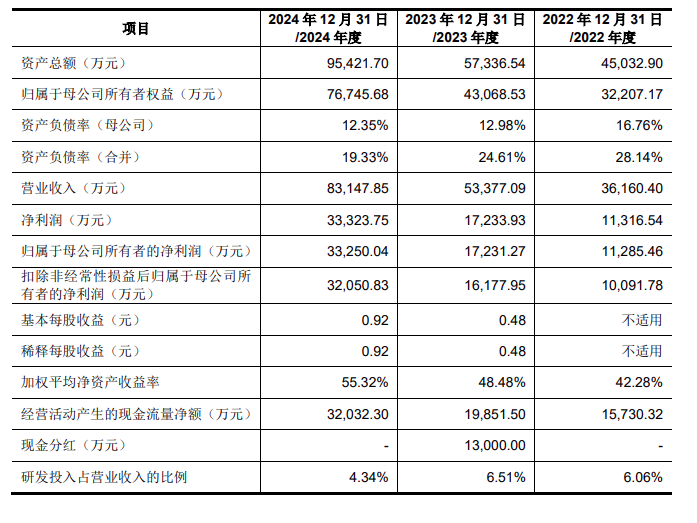 财务数据印证着其增长势能:2022-2024年,该公司营收从36,160.40万元增升至83,147.85万元,复合增长率达51.64%;扣非净利润同步从10,091.78万元跃升至32,050.83万元,毛利率更连续三年攀升至59.76%,显著高于行业平均水平。